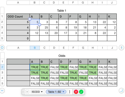 I added Conditional Highlighting to the Odds table to show green for TRUE. You can move the Odds table to another Sheet to 'hide' it if you want.