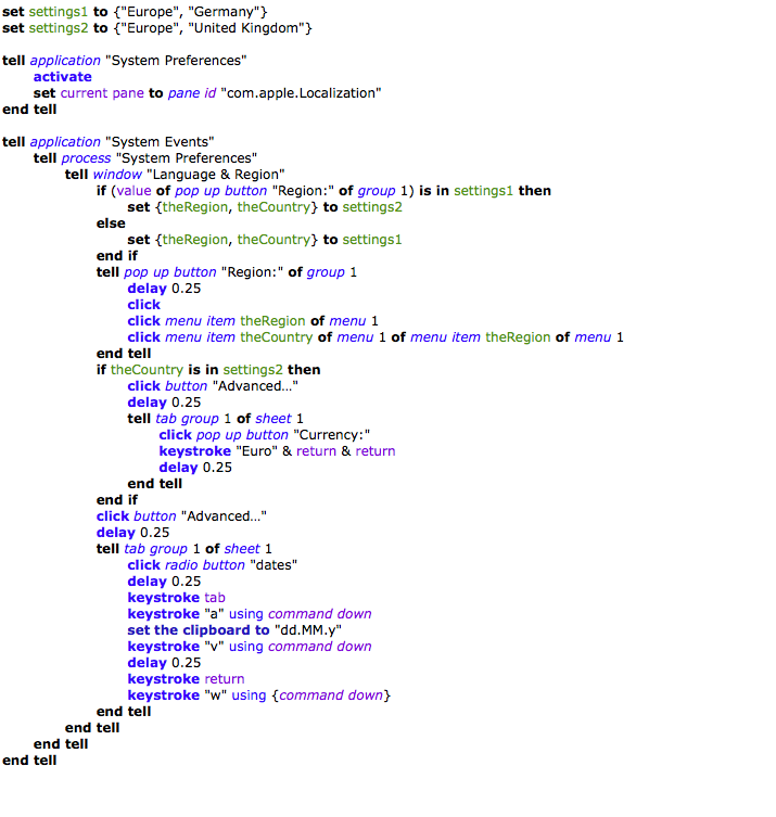 Sorry to be pestering you again – I realised later that my MacBook Pro defaults to using a slash as a delimiter in the short date field for both the UK and German locales. I had changed this manually to full stops but now I'm changing region using the AppleScript, the delimiter defaults back to the slash, i.e. 03/06/2015 whereas I want 03.06.2015.