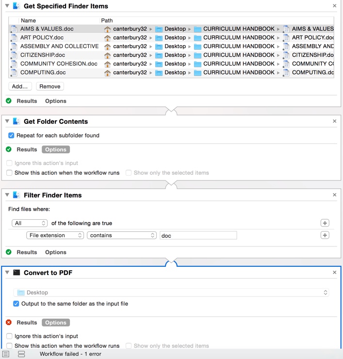 Don't add the word document files in the "get specified finder items" box. Only add the folder that contains them. If they are contained folder in folder structure then select "repeat for each sub folder" . In your case you just need to add the "CURRICULUM HANDBOOK" folder and there is no need to check the "replace for each sub folder found" option