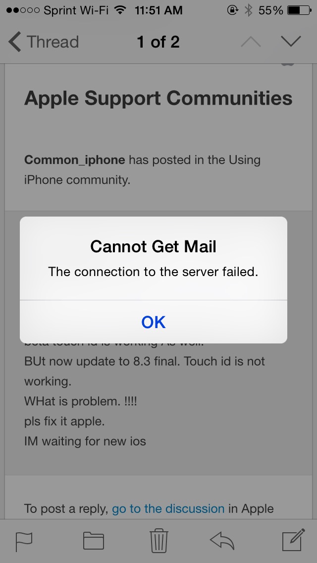 Are you having trouble accessing your mail server, or is your touch ID for downloading apps not working? They are not related and this thread is about Touch ID for downloading apps. If you have a completely different issue, you'd be better served by starting a completely new thread and describing your problem in more detail.