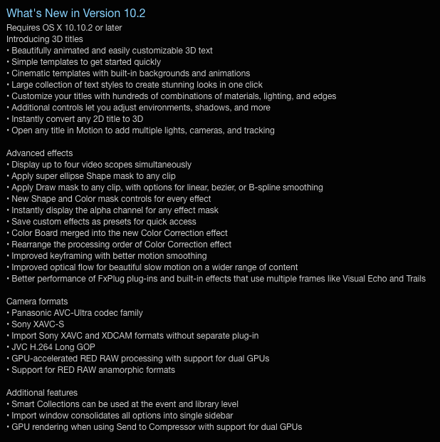 Haven't had time to read the full thread so I apologize if this has been covered... I started having issues with Panasonic AVCHD files before FCPX 10.2. For a few months, starting around the time of the Yosemite, all the clips from Panasonic AVCHD footage that I re-wrapped to MOV outside of FCPX, would not play in QuickTime. They played fine in QT7, VLC, etc. but QuickTime would show black clips with audio. Yet, once I imported them into FCPX (versions before 10.2) everything worked fine. Now at 10.2, like the rest here, nothing works short of transcoding. So, I'm not convinced this is simply an FCPX issue. Clearly something broke in 10.2, but QT couldn't play the clips for months before 10.2.