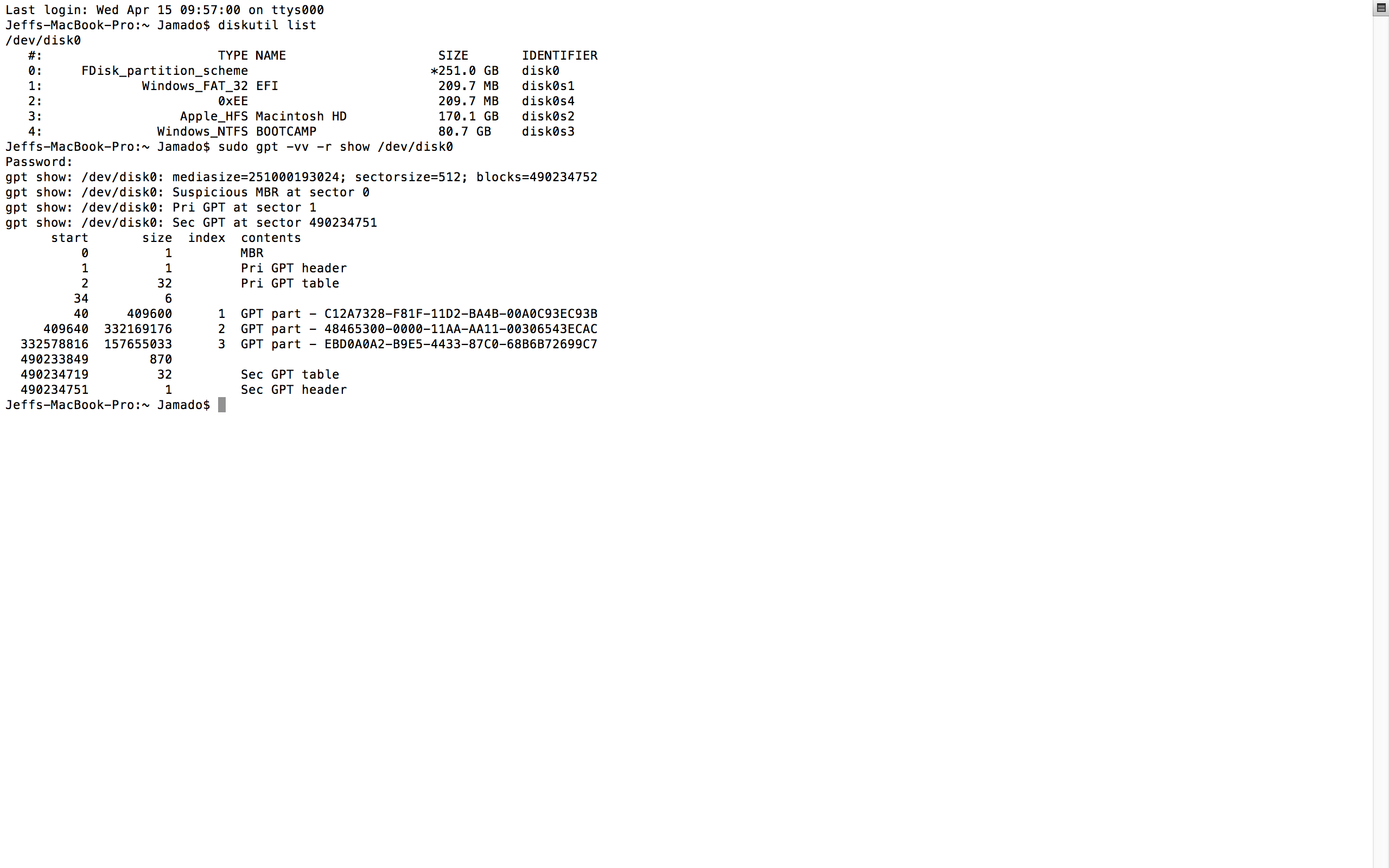 gpt show: /dev/disk0: Pri GPT at sector 1