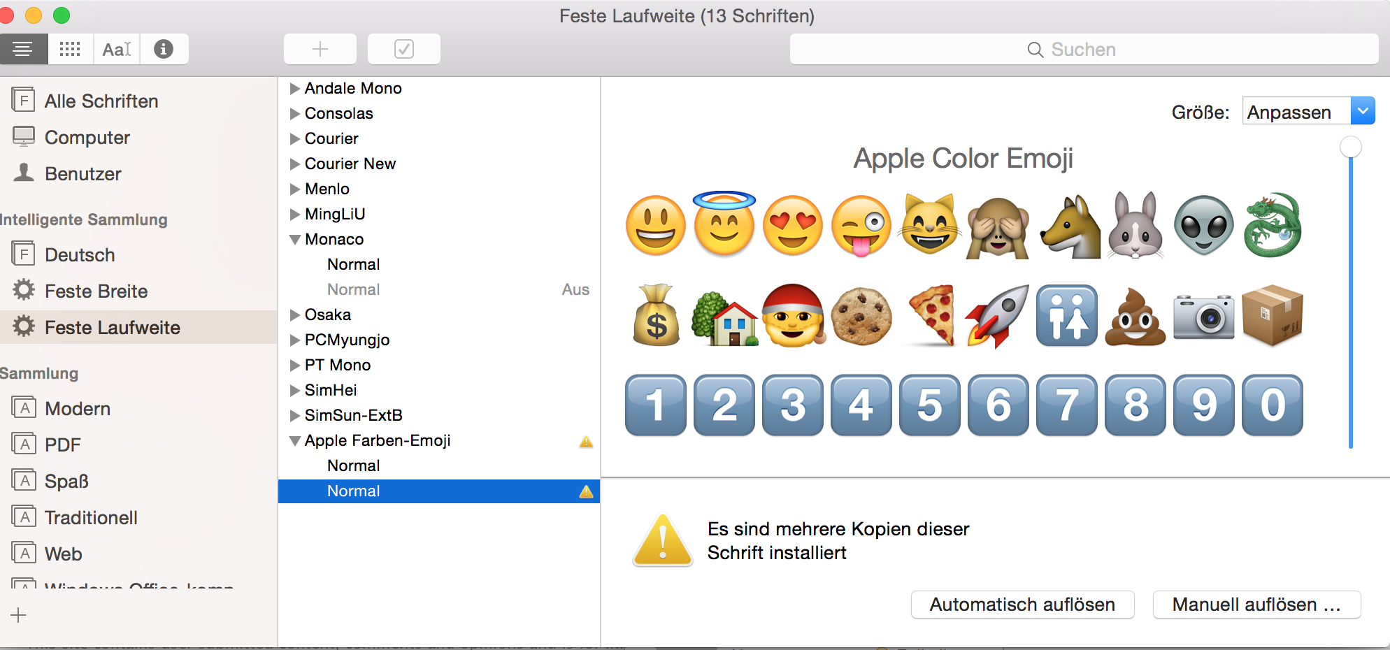 After selecting "Resolve Automatically", all emoji went back to normal state as on my iPad and iPhone. You can also select one of the duplicate fonts and delete or rename the old version. In my case, I had a version from December 2013 and the new one from March 2015. For testing, I renamed the old version to "__Apple Color Emoji.ttf_", so that it doesn't appear in the "Font Book" anymore.