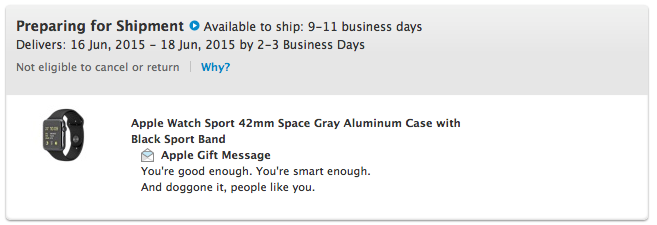 I ordered my black stainless steel with black bracelet back on 4/10. It finally shipped on 6/9, with a delivery date of 6/12. Then, amazingly, it got bumped up to 6/11. I was pretty excited! Then I checked today and I got several notices re: a mechanical failure. The second notice reads