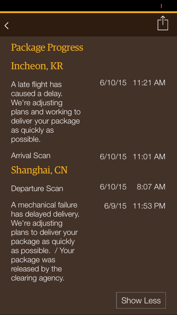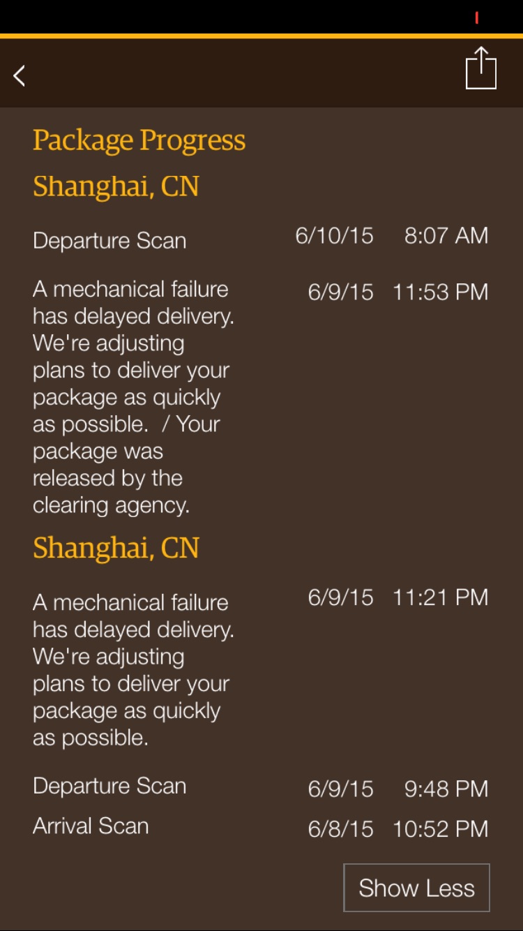 | A mechanical failure has delayed delivery. We're adjusting plans to deliver your package as quickly as possible. / Your package was released by the clearing agency. |