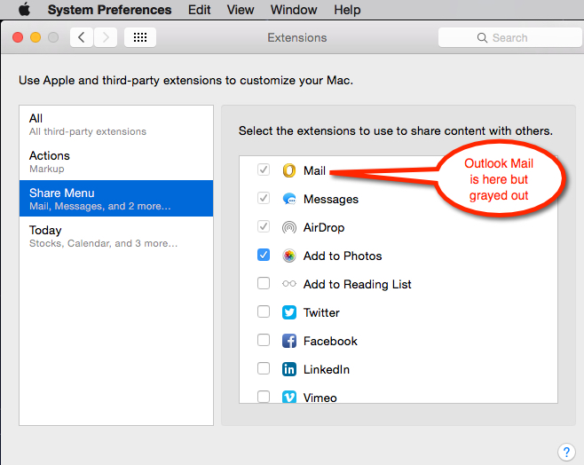 The problem is that the when Outlook is selected as the "default" email application (in Mac Mail's preferences), the "Share Menu" extension for Outlook is grayed out and does not work. You can see this in System Preferences > Extensions window.