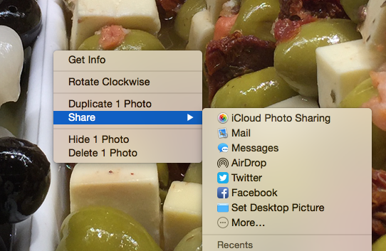 Open Photos and select the picture(s) that you want to send. Once they're selected, go to the Photos > File drop-down menu, then select the "Export" option. I use the first option: "Export n Photos..." (where "n" is the number of pictures selected for exporting. (Alternatively, you can use the indicated Shift+Command+E" keyboard shortcut to Export the selected pictures.