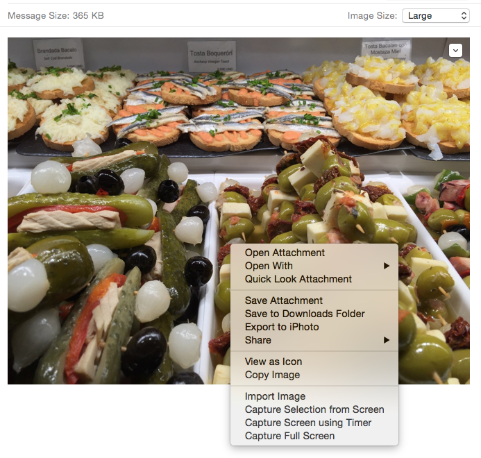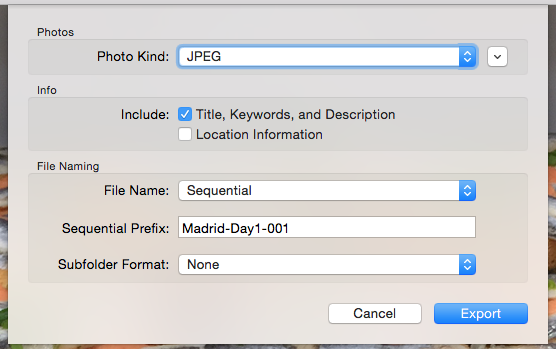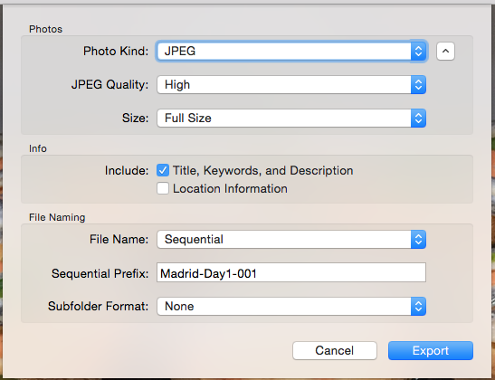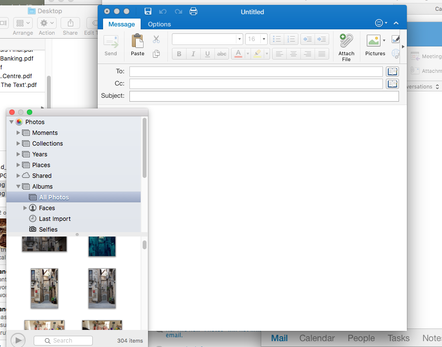 In the resulting window, select the options for the photos: Photo Kind selections are JPEG, TIFF or PNG. Then select the Quality options (Low, Medium, High, Maximum), and Size (Small, Medium, Large, Full Size, Custom). These options can help limit the size of the resulting photo files you'll be attaching to your email message. Then pick the appropriate "Info' and "File Naming" options, and click the "Export" button. Decide where you want to export the file(s) to - I typically just use the Desktop as a temporary repository for the photos, but use whatever works best for you. Now all you have to do is to open Outlook, create a new message, and attach your exported photos. Pretty simple solution and ensures the photos you're sharing are attached in an appropriate size and quality and as standard attachments rather than being embedded in the message body.