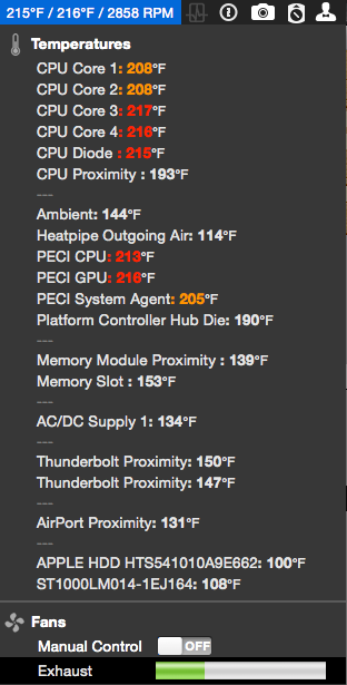 The morons at AppleDoesn'tCare kept arguing with me and refusing to believe my two fan controller apps that were showing temps in excess of 200° even though I sent a screenshot showing 217° at the CPU! They kept insisting the apps were incorrect, but the developers assured me they use the same method of reading sensors as the OS.