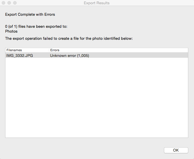 I am having trouble moving photos out of the new Photos app. I tried dragging an dropping, I tried dragging to PS Elements and then I tried exporting to a file on my desktop. Each time I get this message. It seems I cannot export ... any suggestions? Many thanks!!