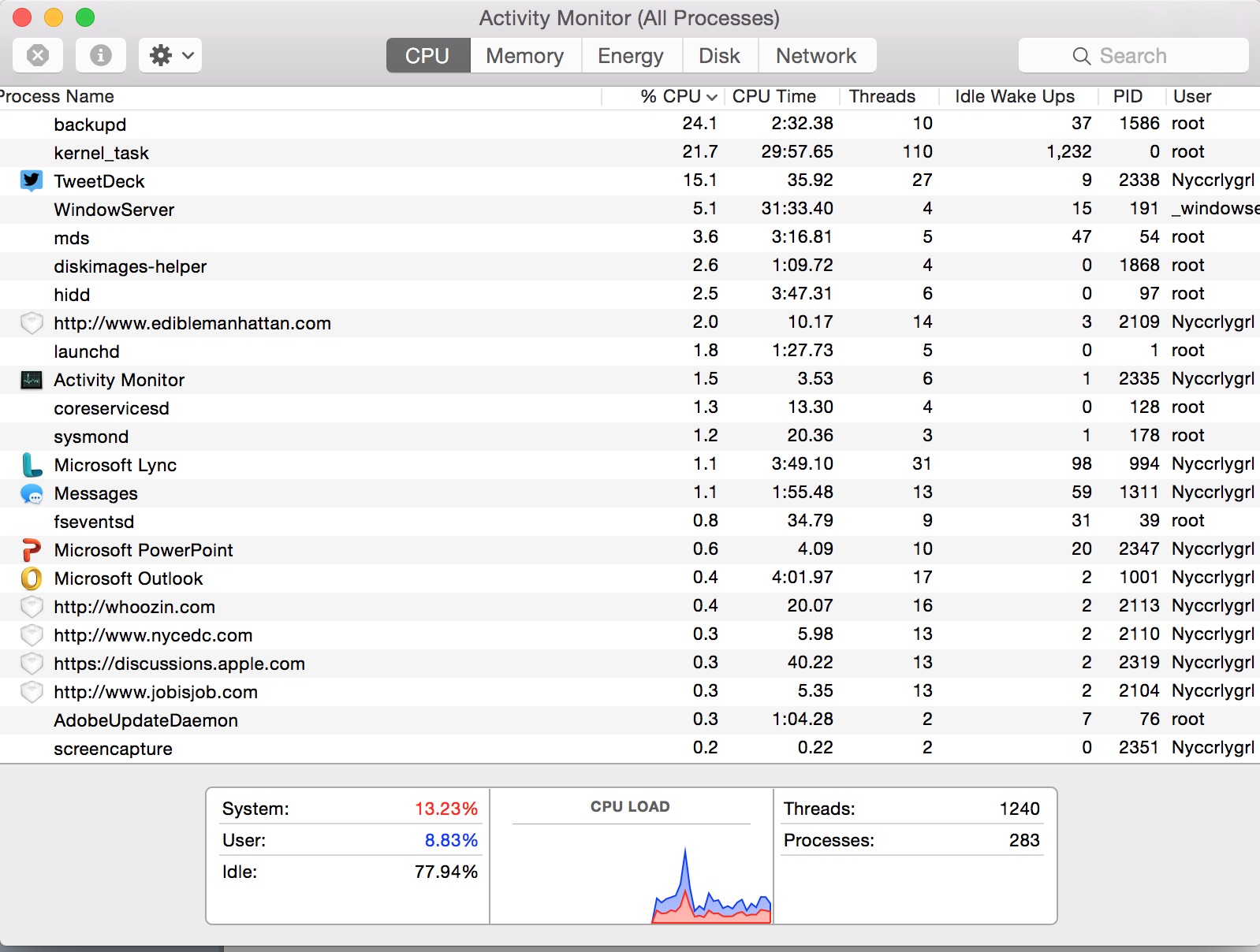 A last thing you can do is use Activity Monitor to see if anything is using an odd amount of resources on you. Go to Finder > Utilities > Activity Monitor. As you can see there is a lot going on, but at the very top left of your screen go to View > Windowed Processes; much better: