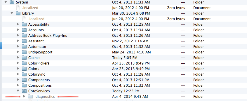 Next, navigate to /System/Library/CoreServices, and drag the .diagnostics folder that you extracted with Pacifist into that location.That will be in the Macintosh HD folder.
