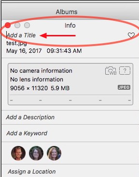 So, to the question, which remains: is there a simple way to change (or to create, if you prefer) the title of an image, in Photos (I have the newest version of Sierra, just installed last week) ? When I attempt to rewrite the name of an image, thus making it the title of my choice, in the info pane, I'm asked if I want to delete the image . . .