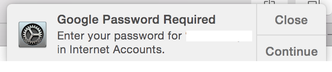 I keep getting the following notification to enter my Google password in internet accounts since updating to 10.10.3. I have Google's two-factor authentication enabled and have already entered my password through internet accounts but I keep getting this notification every few days. I have tried removing the account and adding again, but the same thing happens.