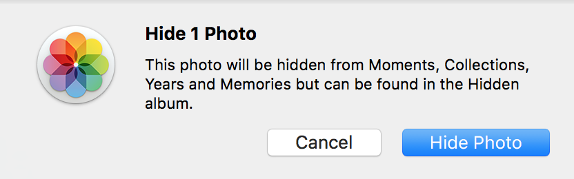 Note: Photos or videos are hidden from Moments, Collections, and Years, but are still visible in Albums.