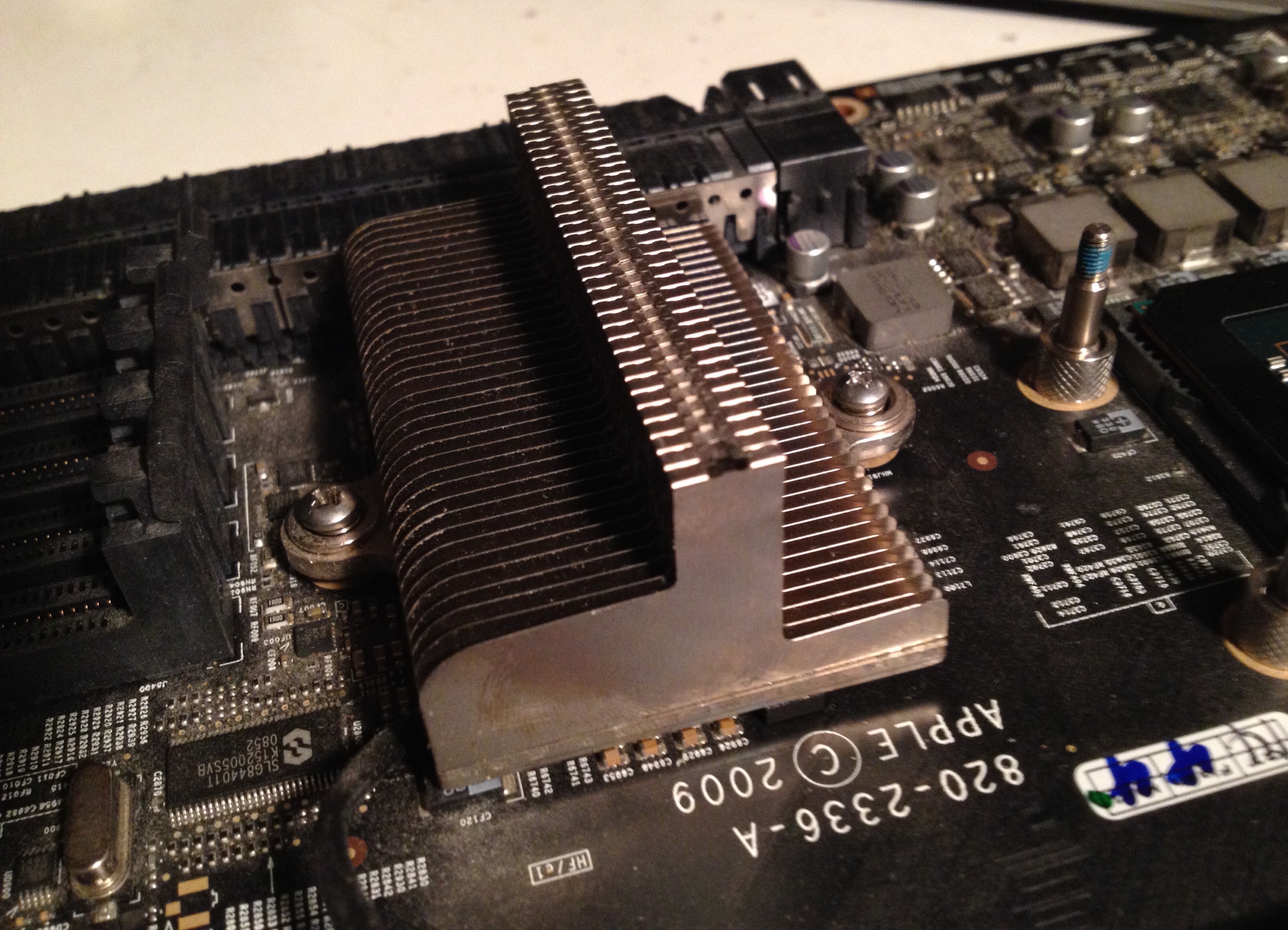There is a substantial chip, sometimes referred to as the NorthBridge, on the CPU/Memory card. Its heatsink is held in place with two black plastic pins. These rarely break, but when they do, the heatsink on the hottest chip in your Mac Pro is left flapping in the breeze.