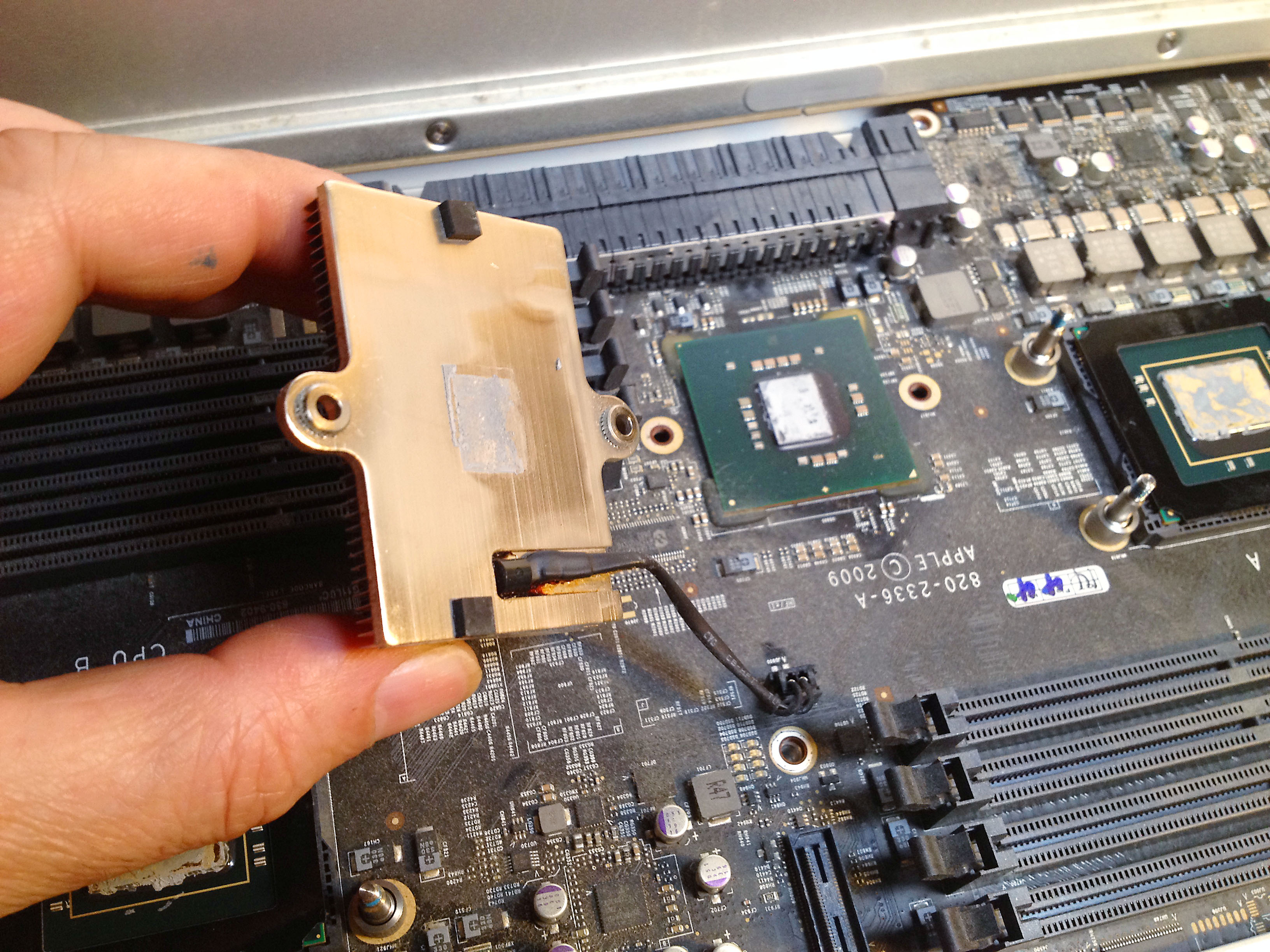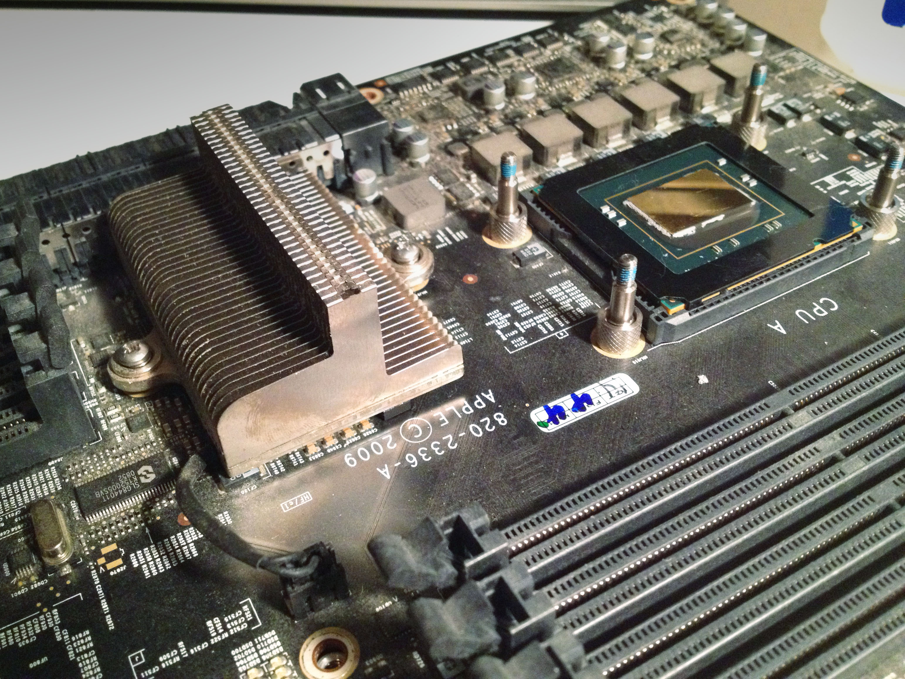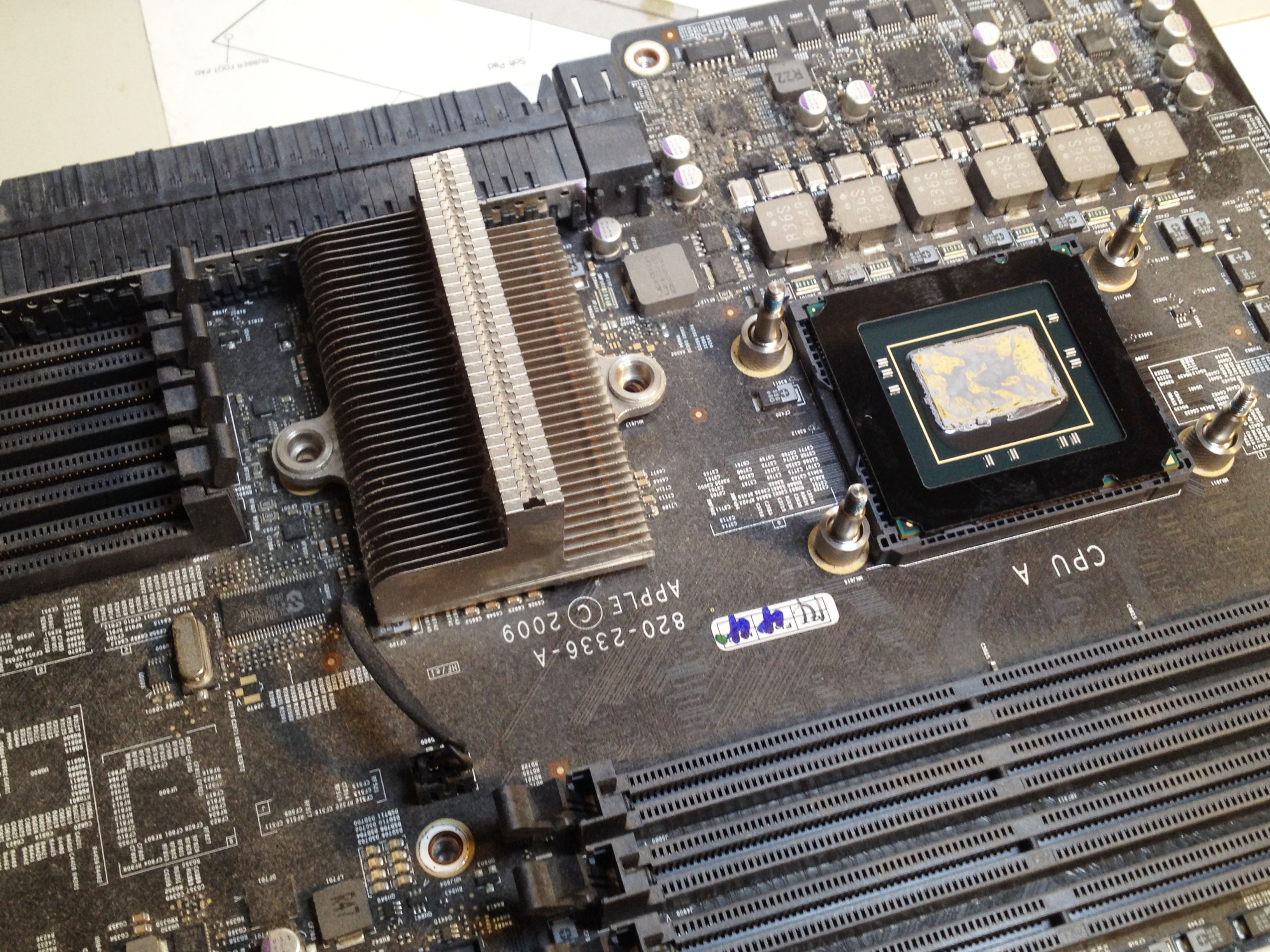 I did have a BIG scare, though. The first time I booted the Mac Pro 2009 after repair, the inside of the cabinet lit up with red lights like Santa's sleigh. At that point I thought I had shorted out the logic board but there was no odor or smoke. I took off the CPU heat sinks and inspected the processor modules. Much to my horror, I had bent about two dozen of the very delicate contacts on both CPU mounts. With an X-Acto knife I gingerly bent the leaf contacts back into position, reapplied thermal paste, reattached the heat sinks and said a prayer. It booted!