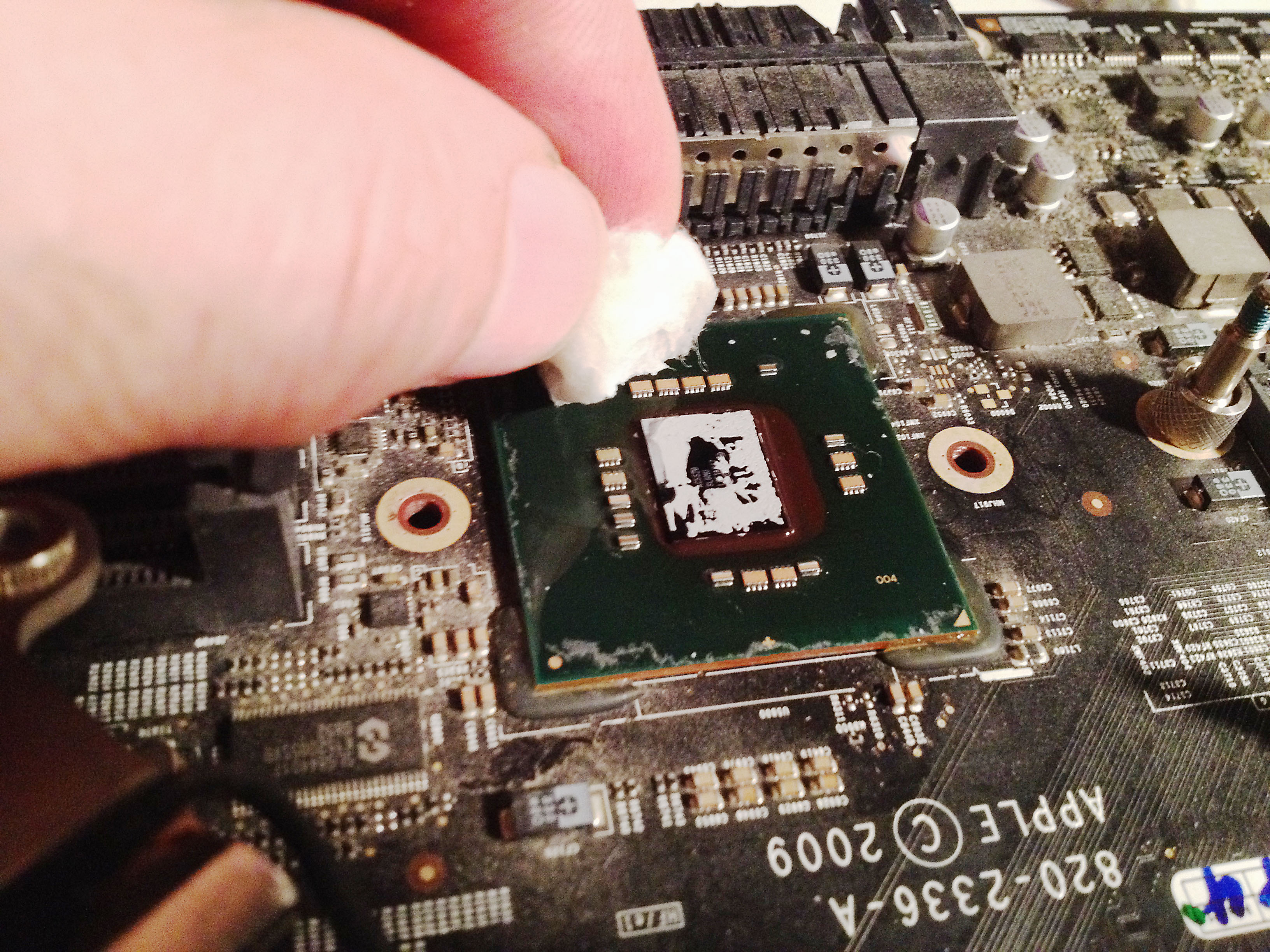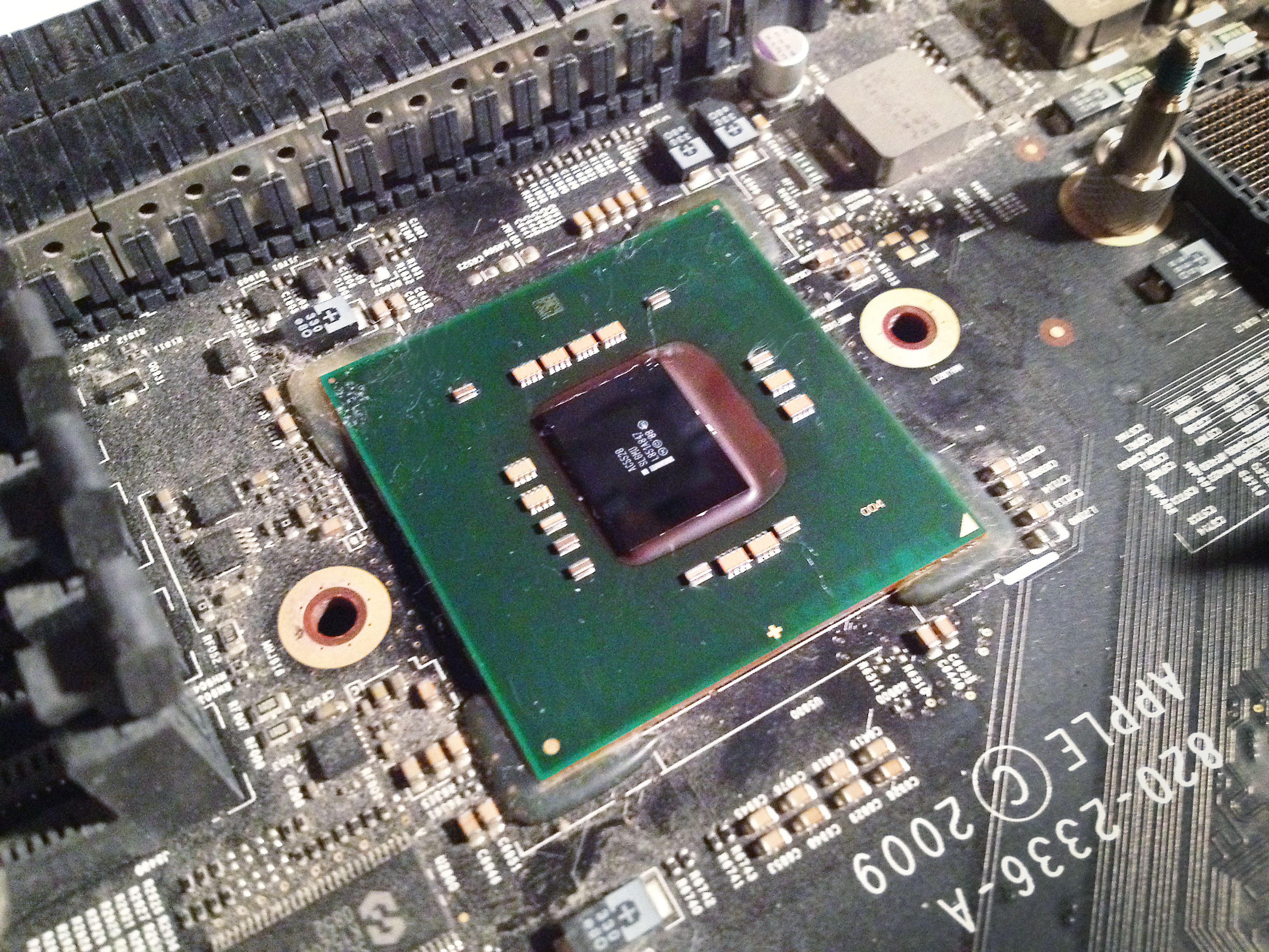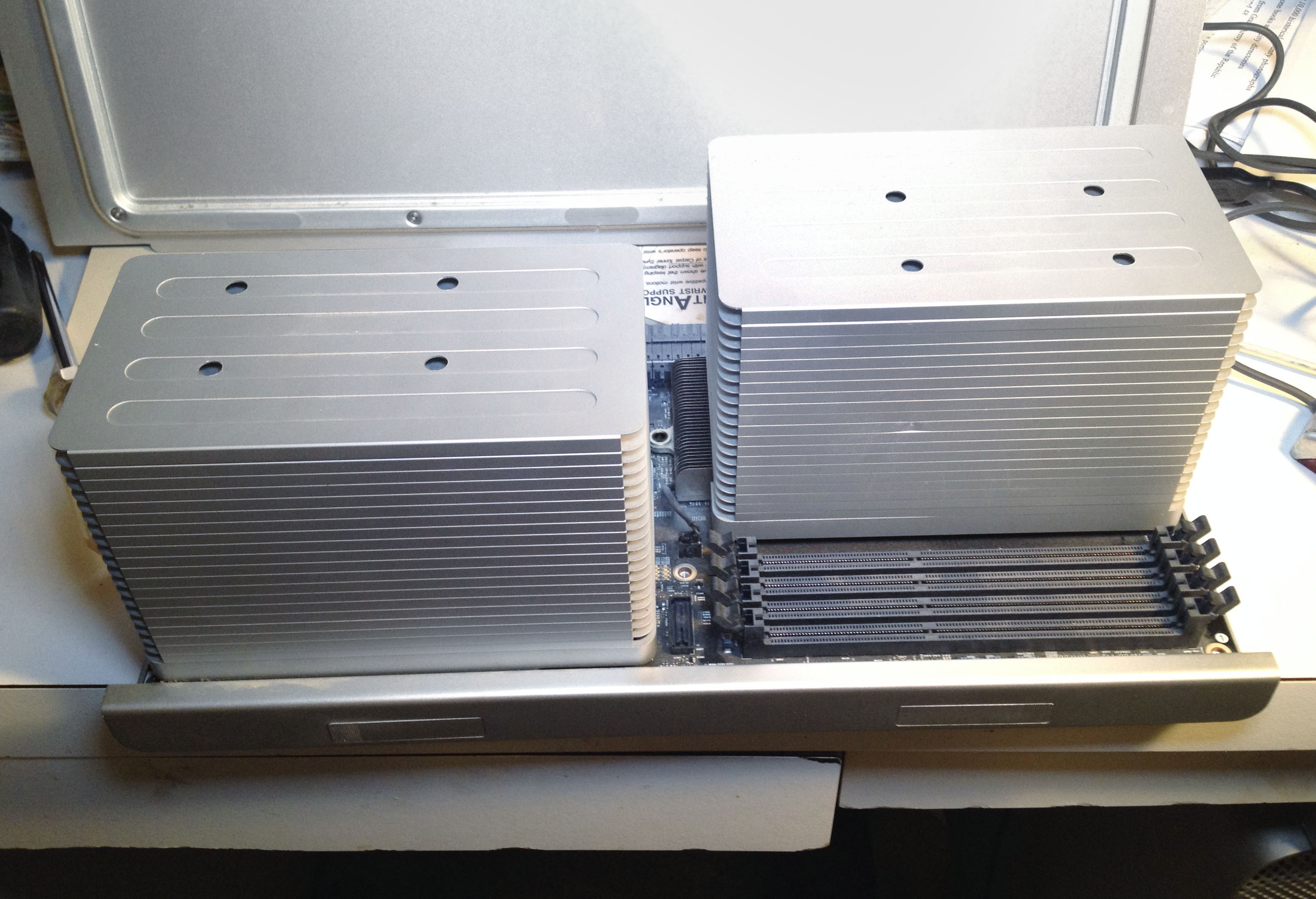 I did have a BIG scare, though. The first time I booted the Mac Pro 2009 after repair, the inside of the cabinet lit up with red lights like Santa's sleigh. At that point I thought I had shorted out the logic board but there was no odor or smoke. I took off the CPU heat sinks and inspected the processor modules. Much to my horror, I had bent about two dozen of the very delicate contacts on both CPU mounts. With an X-Acto knife I gingerly bent the leaf contacts back into position, reapplied thermal paste, reattached the heat sinks and said a prayer. It booted!