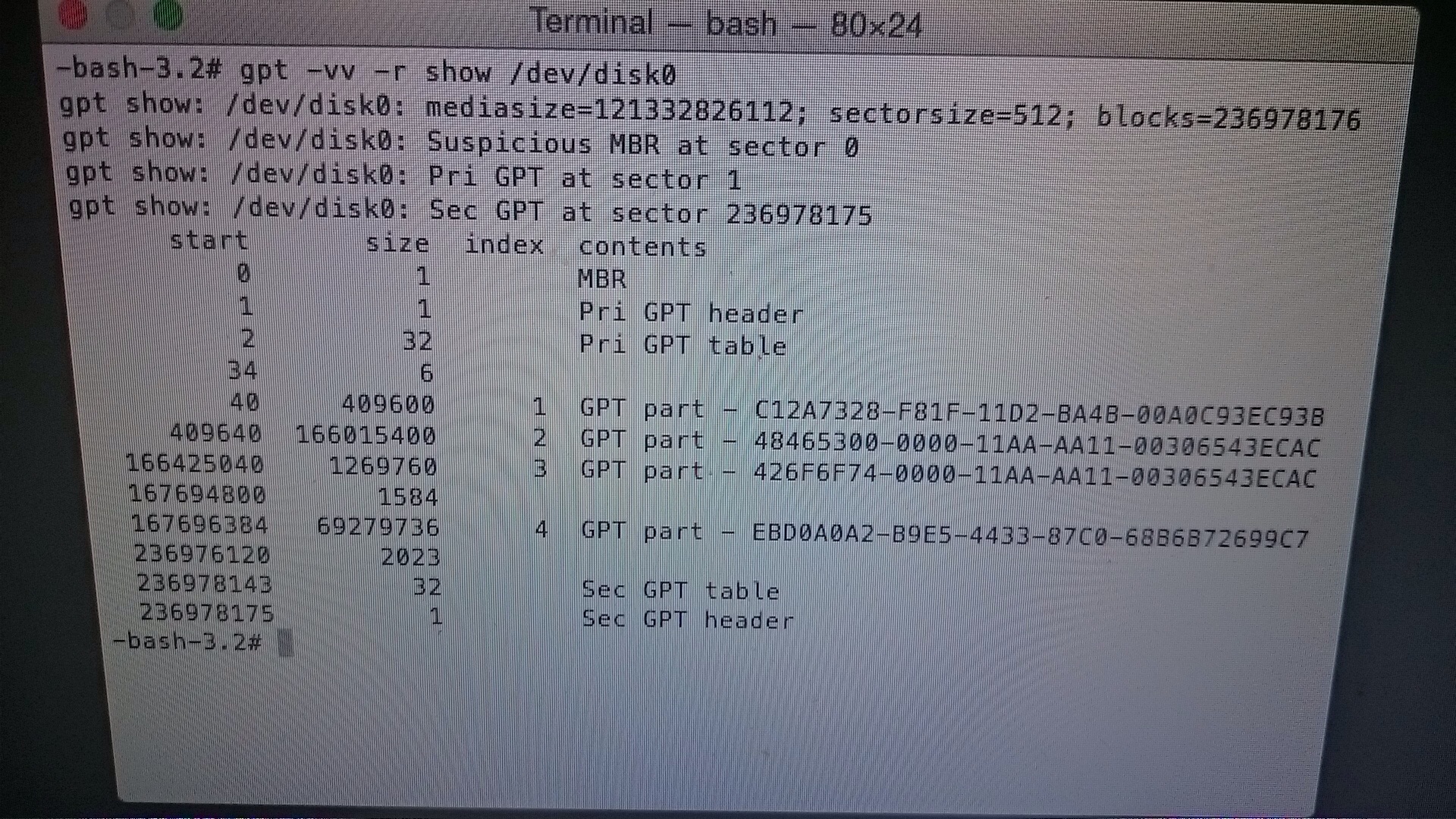 gpt show: /dev/disk0: mediasize=121332826112; sectorsize=512; blocks=236978176