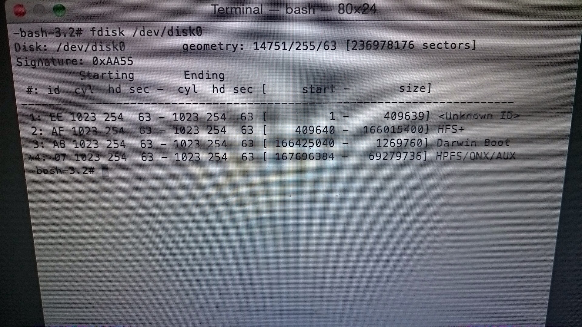 Disk: /dev/disk0 geometry: 14751/255/63 [236978176 sectors]