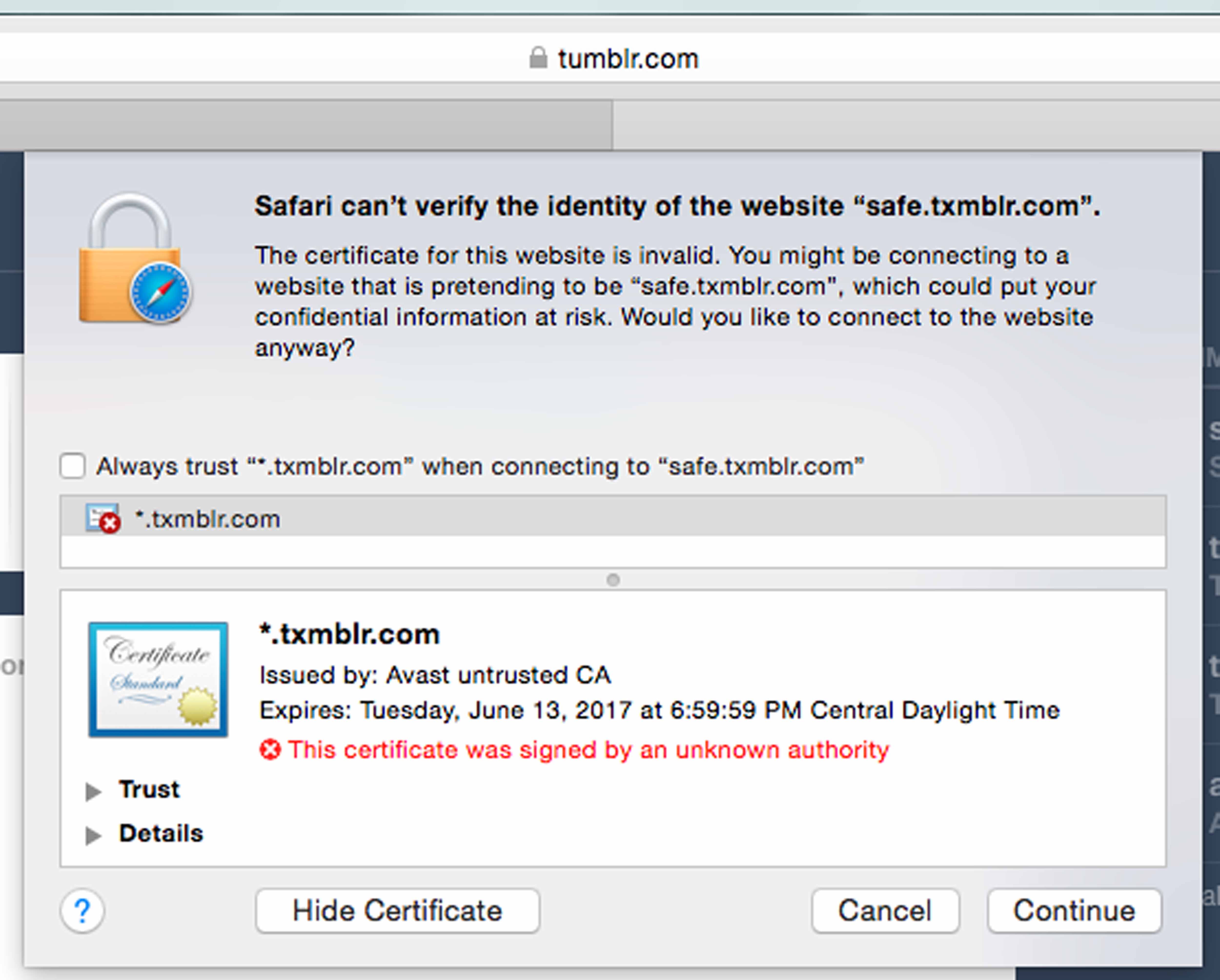 Why does my Safari reroute the tumblr URL to safe.txmblr.com and say that the certificate could be fake? It may be related to Avast, or possibly some sort of keychain error.