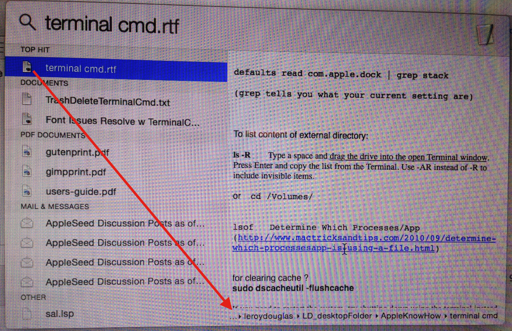 I have some old files, I can't remember where they are. I found one through spotlight, but clicking "command" it won't show the file path. I can open the file, but can't get info or anything to find the file path. There are other files I need in with this one whereever it is located, but how do I find the file path of an open file. I don't know the icon as I opened it through spotlight, and spotlight won't show the file path for some reason.