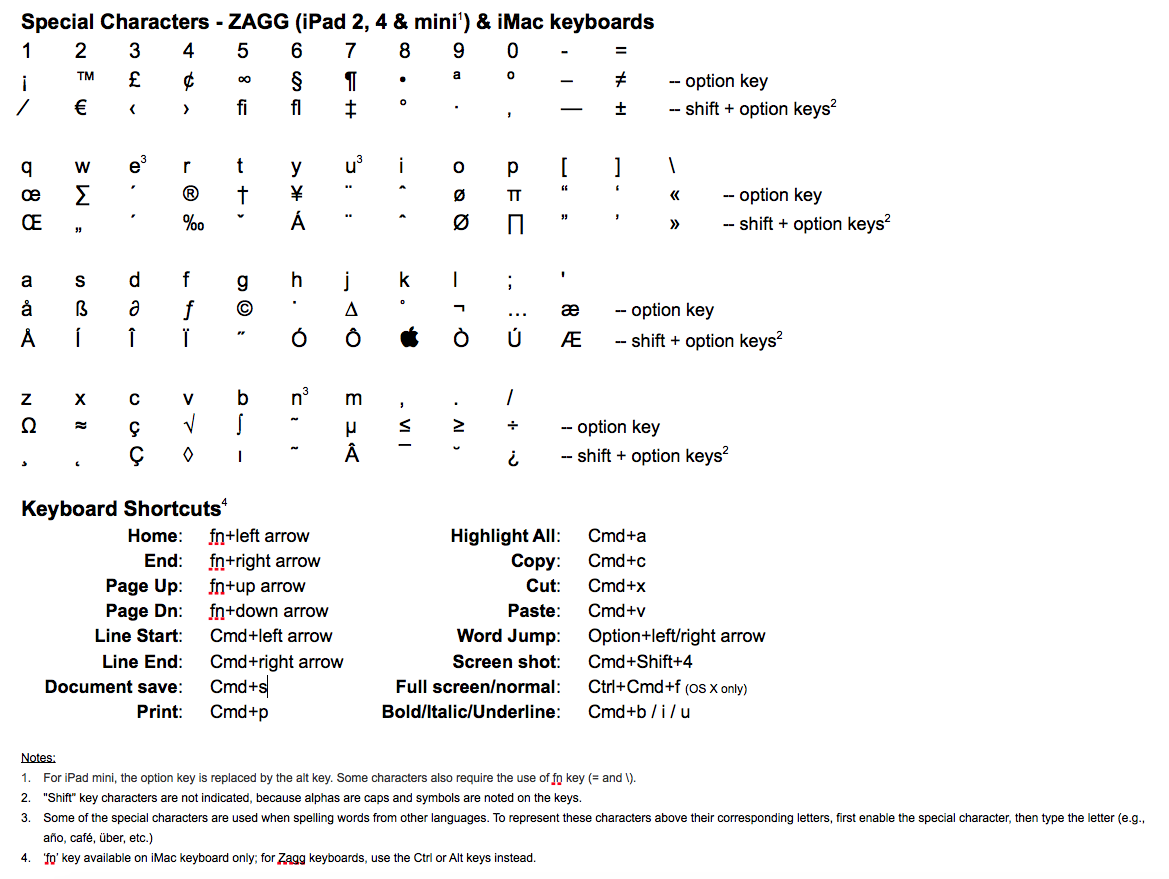 With a bluetooth keyboard for a tablet device, the keyboard has a bit more logic built into it in order to communicate with the specific tablet OS. That's why Logitech, Zagg, etc. sell ones specific for iOS versus Android. In my case, I am using an iMac running OS X Yosemite with a standard Apple bluetooth keyboard. I also have a Zagg Keys Folio bluetooth keyboard for my iPad mini running iOS 8.3. With about 95% certainty, any keypress combination on my Apple b/t keyboard can be replicated on the Zagg keyboard with the same result. (See attached image as an example.)