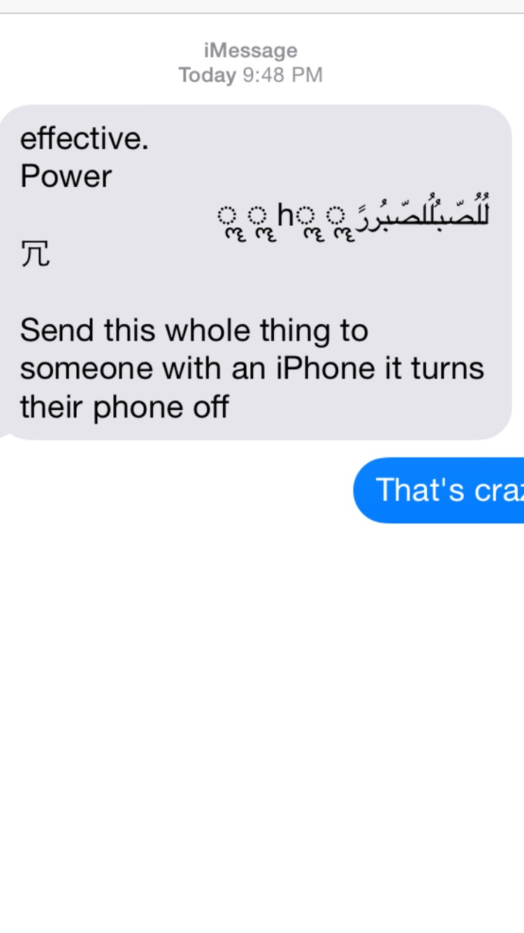 if ur having problems opening ur messages but u know who it is like ur friend sent u that or some number, all u got to do to resolve the issue is send a photo to that person or friend it basically resolves the issue. you dont have to necessarily send a picture of ur self to that person or number just send somthing and then if that friend or number keeps send u that code, right after u send a photo block him/her. This code below is what locks ur iMessages from opening but it won't shut ur off ur iPhone it just prevents u from opening ur messages. It's bascially just the code without saying effective power first.