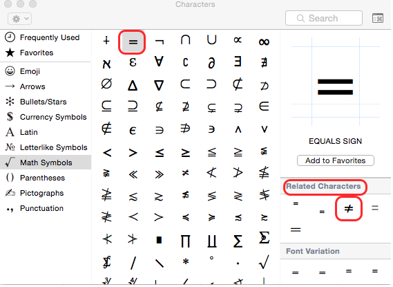 Does Pages have a "does not equal" character, one consisting of an equal sign with a forward slash through it?