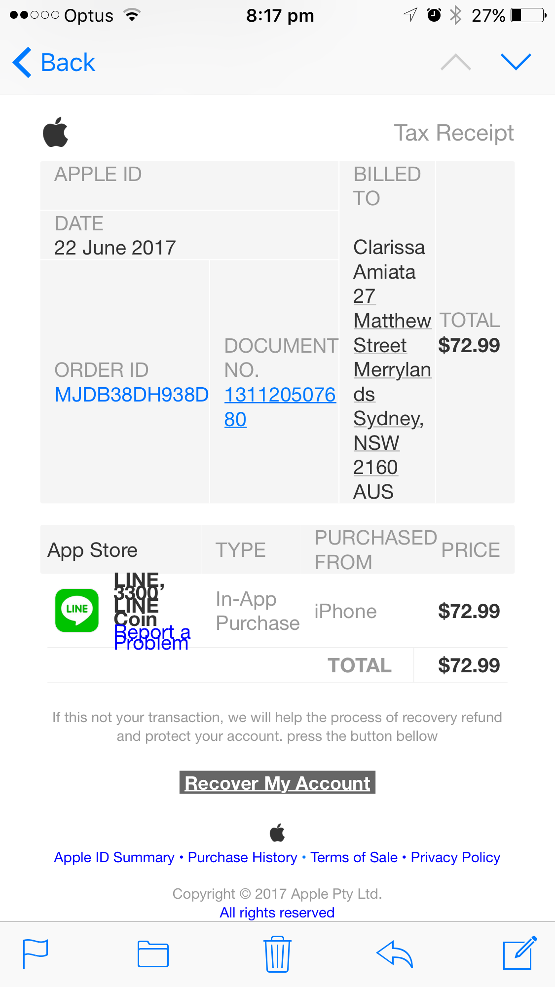 The sender's email address is do_not_reply @ fc7c0c-itunes. com. au. This not the regular email address from iTunes. Has anyone else received this type of email?