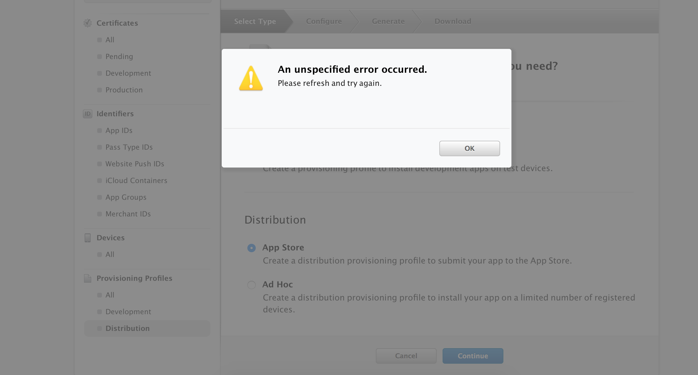 I have been getting this error for most of the day today? Can't seem to get past it - I have reset computer, reset modem, reset IP, tried it under development or all - simple can not create a new provisioning file....getting quite annoyed about it.