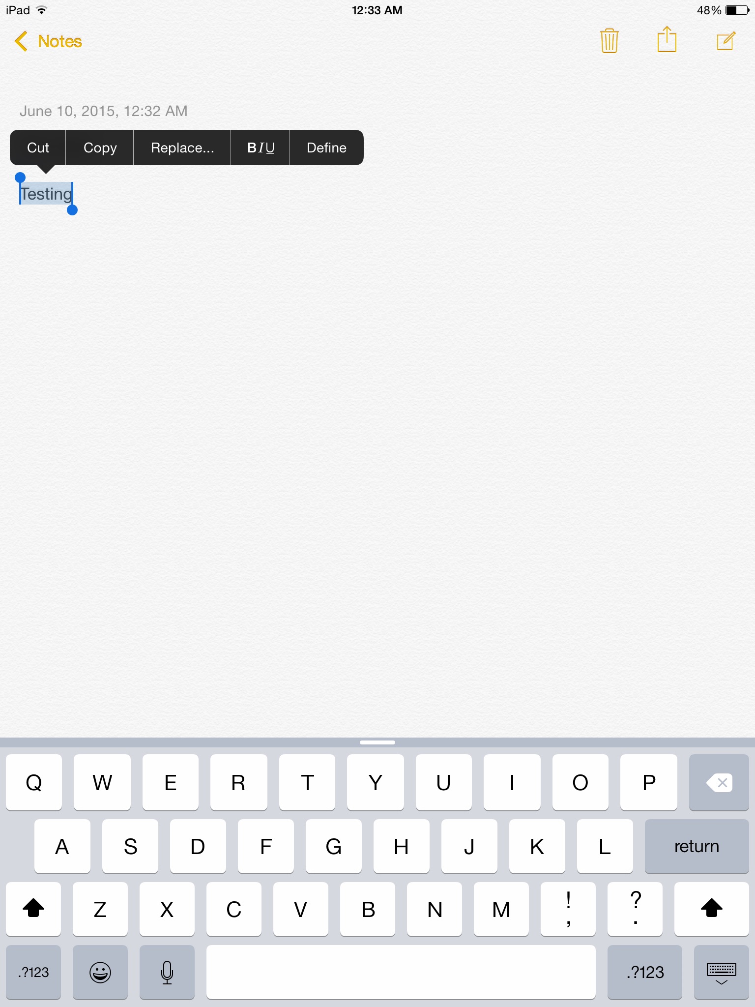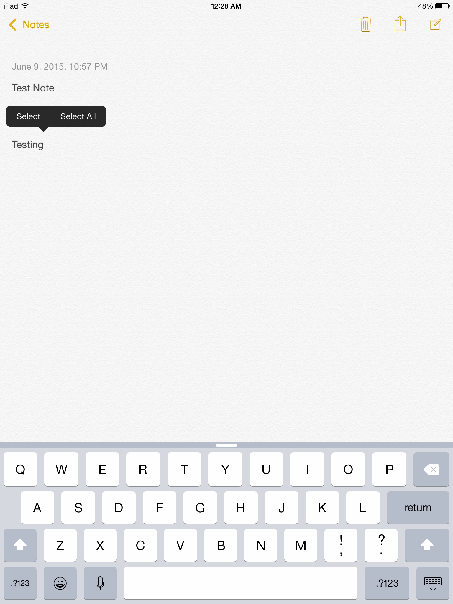 I have an iPad Mini, Model A1454, Wi-Fi & Cellular. I have iOS 8.3 on the device. I just created a new Note, tapped on the screen and the menu came up that states Select, Select All, Paste, Insert Photo. So, your iPad, 4th Gen, is newer than mine and I can do it. As far as your comment "select and area of text/space" are you trying to do something in particular there. All I did was tap on the screen to bring it up.