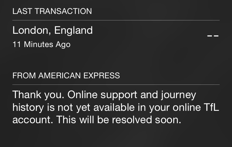 And this message appears on the iPhone after using Apple Pay on TfL with an American Express card: