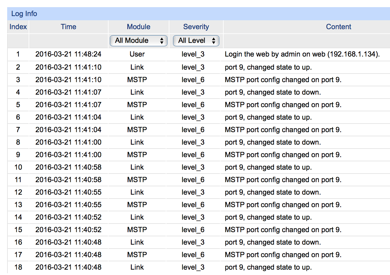 <188>1 2015-06-15T21:35:19.924951+12:00 10.1.11.56 %STP-W-PORTSTATUS - - - %STP-W-PORTSTATUS: 2/g11: STP status Forwarding