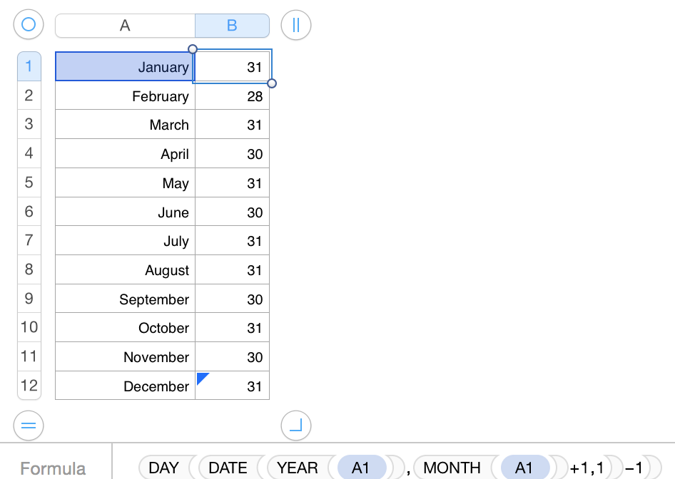 =EOMONTH(DATE($C$1, B3, 1),0)−DATE($C$1, B3, 1)