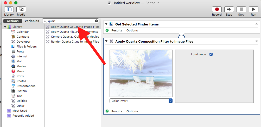 An easy way to invert the colors of any photo you can select in the Finder is an Automator workflow like this.