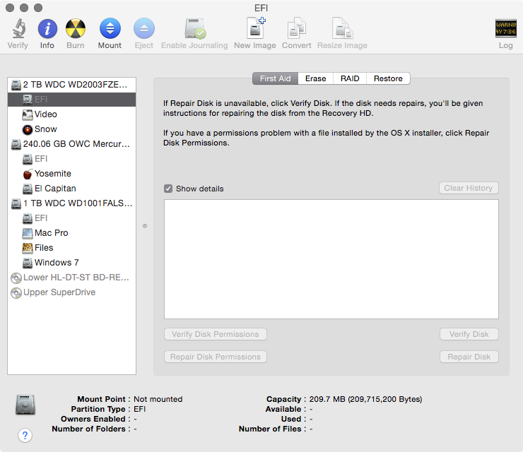 Every physical drive that has been partitioned as GUID for the Mac will have an EFI table at the top of the drive, such as below. I set up Disk Utility to show the developer menu, which enables you to show all partitions, including normally hidden ones, such as the EFI tables. They also have no format to speak of. I highlighted one of them so you can see what information is shown for an EFI partition. Anyway, it's completely normal.