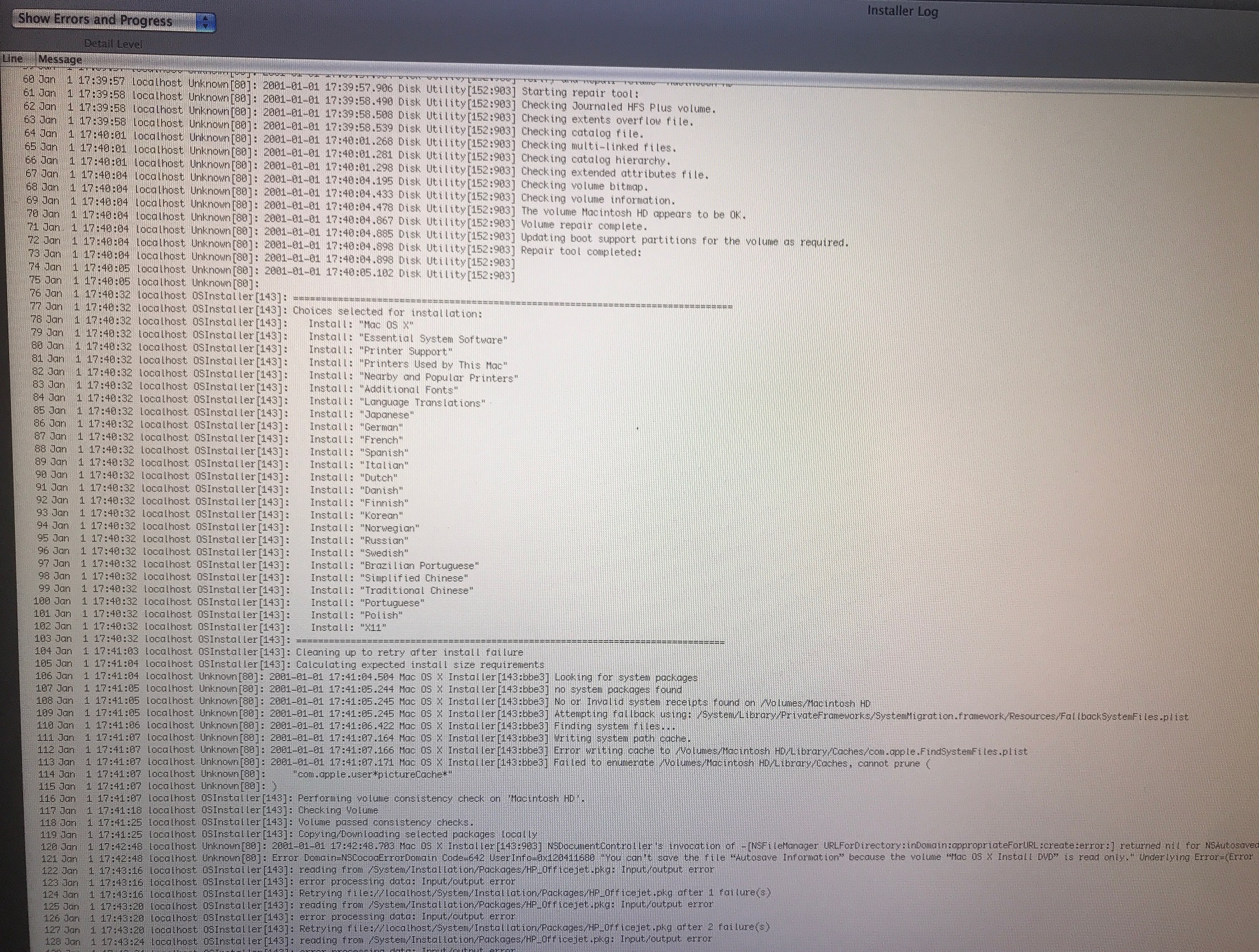 The first thing the log file more or less does in the OSX installation is to install printer drivers, nearby printers, and it would hang first thing on an HP printer driver installation.