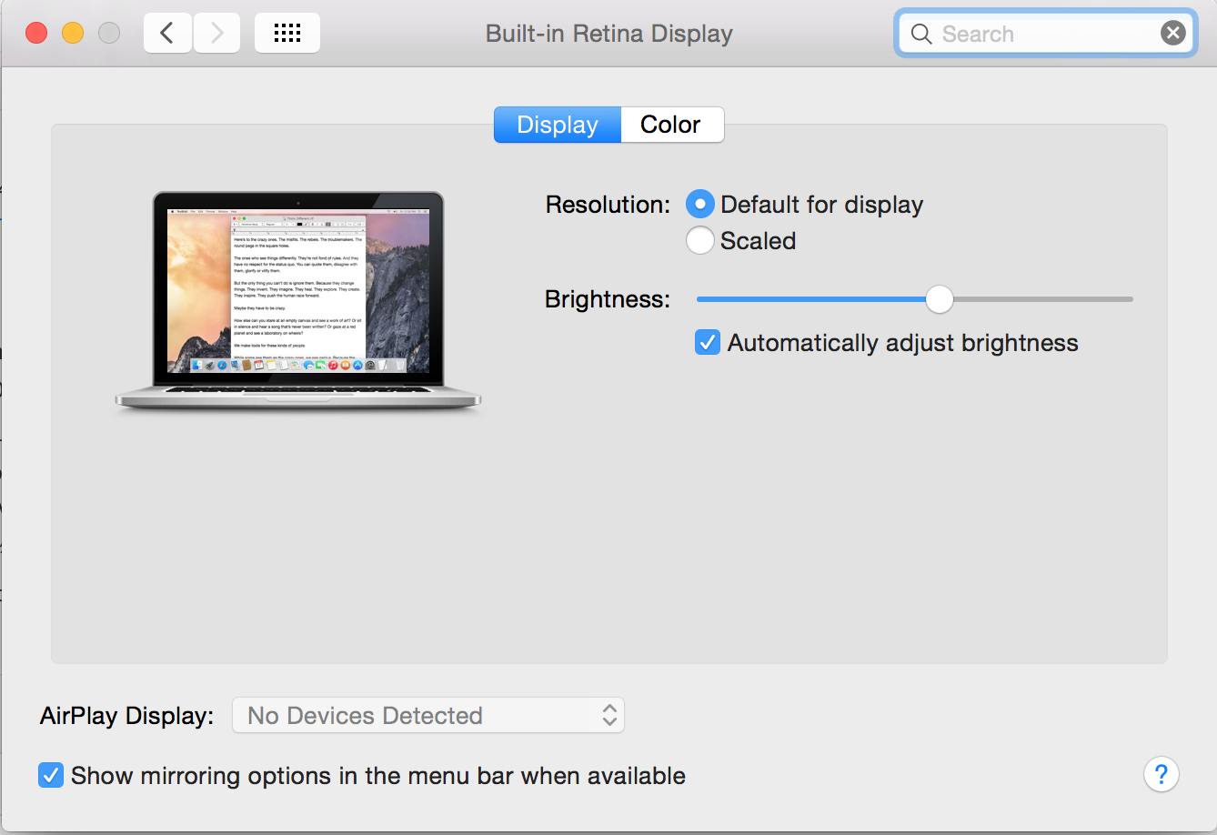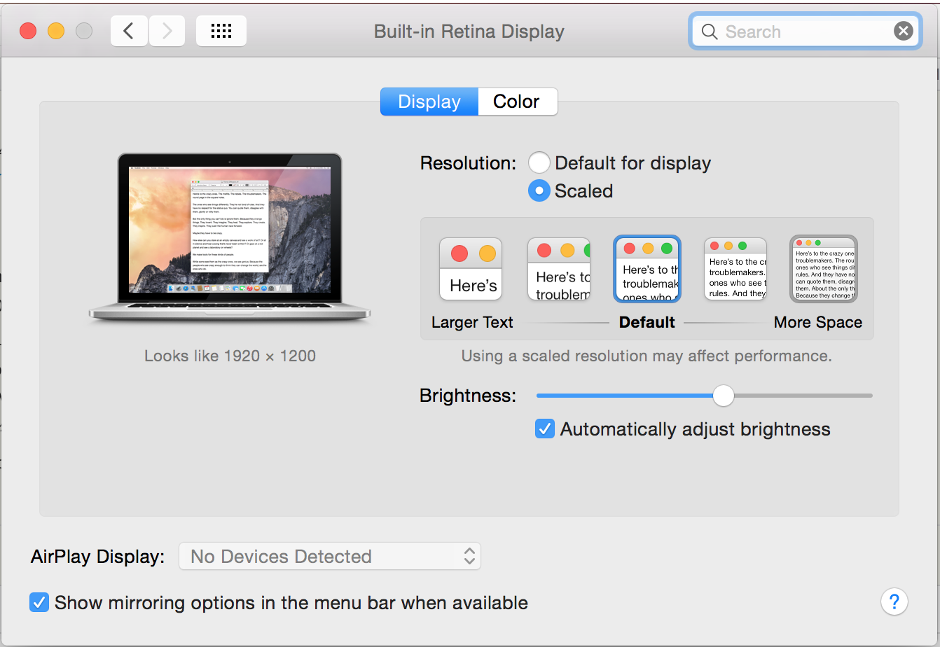 default resolution is 1440x900 and use scaled is max 1920x1200. I can't to setting in 2880x1800 same space is show http://store.apple.com/th/buy-mac/macbook-pro
