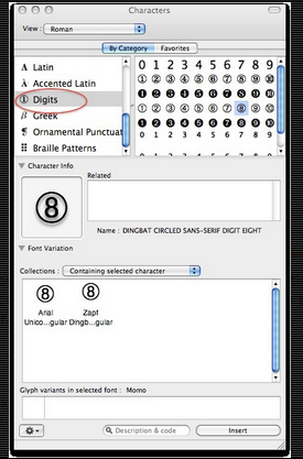 Often, you will see Unicode characters represented as U+2460 ① . You can actually type this unicode string in the Character Viewer search window, and the corresponding character code will appear. In HTML, it would be represented as "①" without the quotes. You can see these values in the previously linked Enclosed Alphanumerics chart.