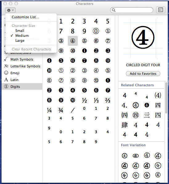 Recent screenshot of Mavericks 'Character Viewer' w/ enabled Digits section, follows: