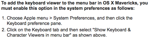 •OS X Mavericks: Use the Keyboard Viewer - apple support (also for character viewer)