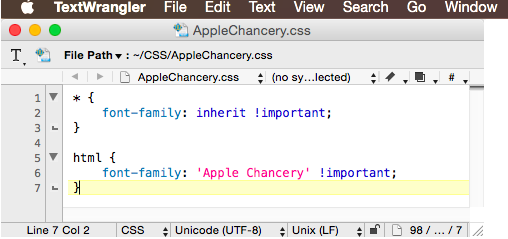 1. Type your CSS code into a plain text editor such as TextEdit or TextWrangler. Save the document with a .css extension to a location of your choosing such as /Users/<username>/CSS/AppleChancery.css.