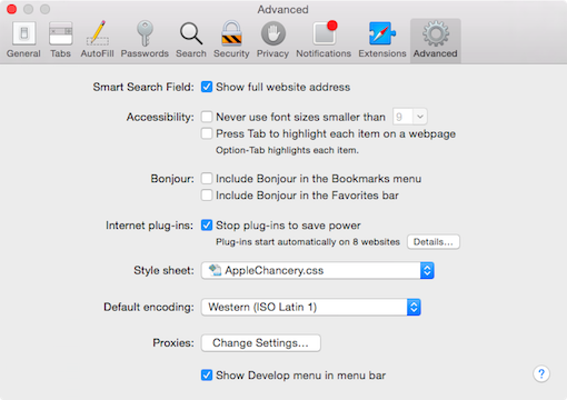 2. Navigate to Safari > Preferences > Advanced > Style Sheet from Safari's menu bar and click the selection button. Select "Other..." from the pop-up menu and navigate to the location of your CSS file. Select and press the Enter key. Enjoy your new Safari font!