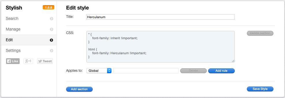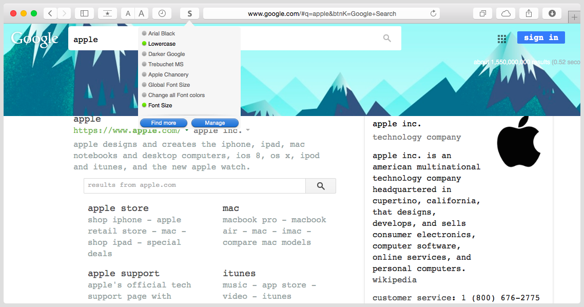 4. Navigate to the Stylish button in Safari's toolbar and click on it. Click on the name you gave your style and the grey selection indicator will turn green. Enjoy your font!