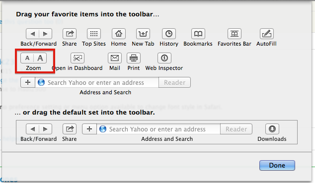 Note the icon I outlined in a red rectangle; drag it to Safari's toolbar and you can click the larger "A" to increase font size for better readability. Clicking the same "A" reduces the font size.