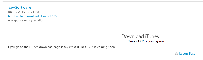 Weird things going on. When I started downloading iOS 8.4 I also started downloading, what I thought would be the right version of iTunes but it was iTunes 12.1.2. Now as I went to iTunes' download site the version there was 12.1. so I downloaded it as you can see. As I tried to install (out of curiosity) it said a never version is already installed as I suspected it would. Anyone have the same experience?