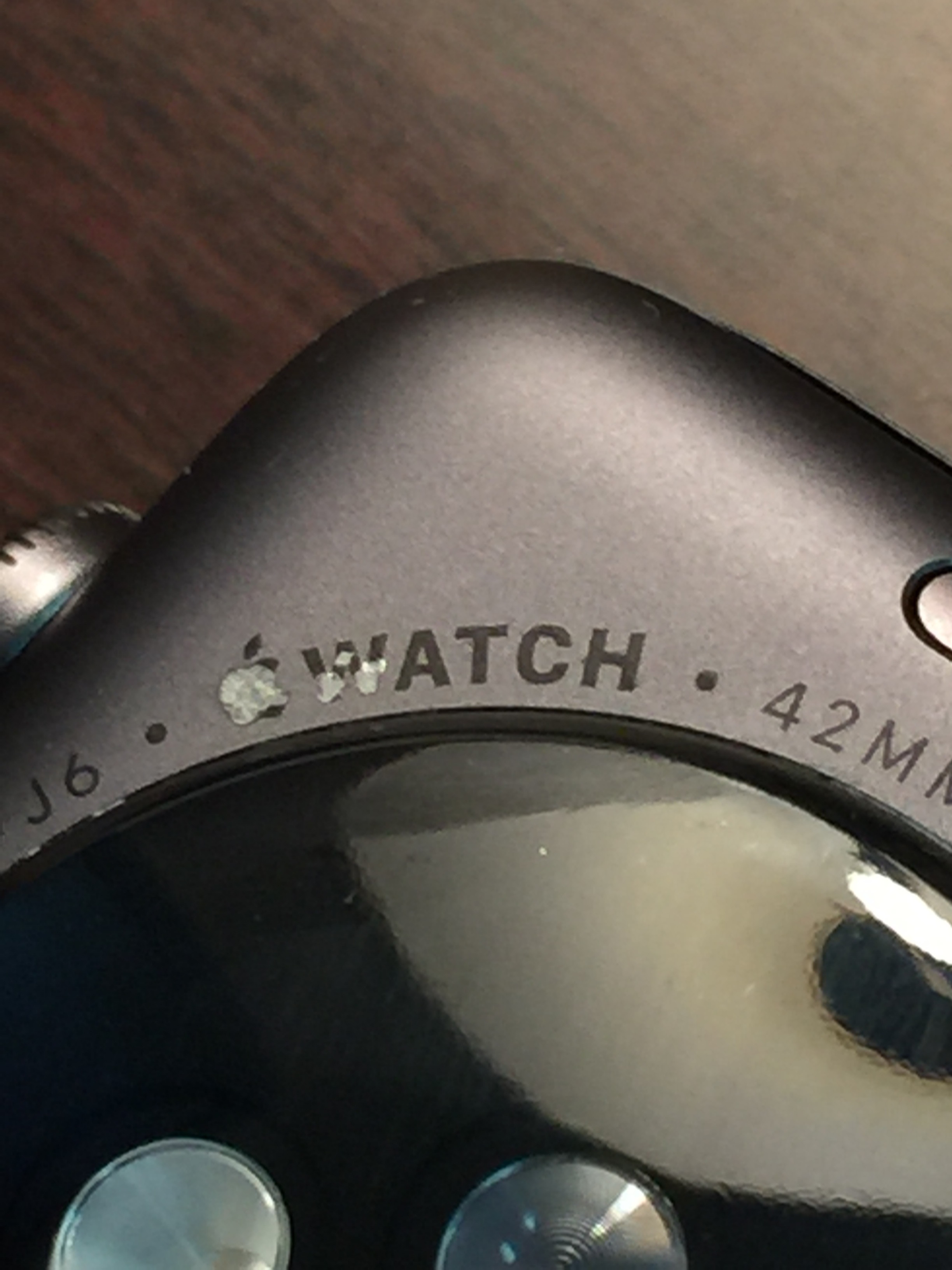 I received my 42 mm space gray Apple Watch Sport on June 2nd, but did not activate and start wearing it until June 5th. I've worn it daily since then as my primary timepiece. I've used the watch for runs and workouts almost everyday. On June 27th, I noticed that the anodized coating on the back, right where the Apple emblem was etched, has flaked off. The flaking has not spread over the past few days. There is no other cosmetic damage to the watch. I haven't been able to figure out how this happened since that portion of the watch is against my skin and not exposed to hard elements that could cause this. Is this defect covered by Apple Care? If so, what is the fix?