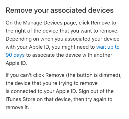 When opening iTunes and clicking on Account Info > Manage Devices, the ability to click the remove button next to my associated devices is grayed out.