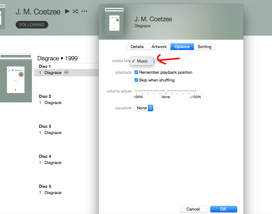 I've tried File > Get Info > Options. At this point it's not possible to select audiobook as media type. The only option showing is music, no other choices.